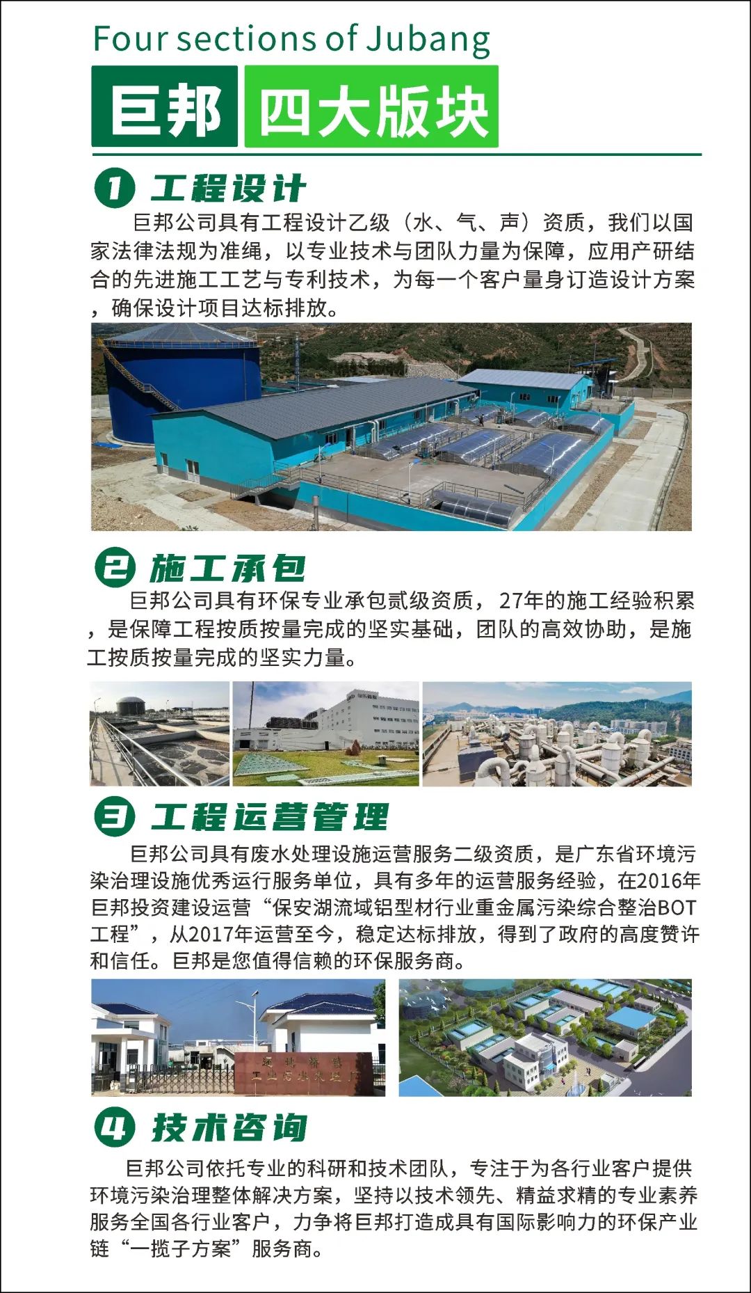 据悉,广州巨邦环保工程设备有限公司——环保产业链综合服务商,成立于1995年,历经二十多年的发展,筚路蓝缕,戮力前行,已成长为一家涵盖工程设计、施工总承包、工程运营管理、技术咨询四大板块的专业环保企业。公司核心技术集中于工业废水治理、废气治理、河涌治理、土壤修复等领域,专注于为客户提供环境生态治理整体解决方案。